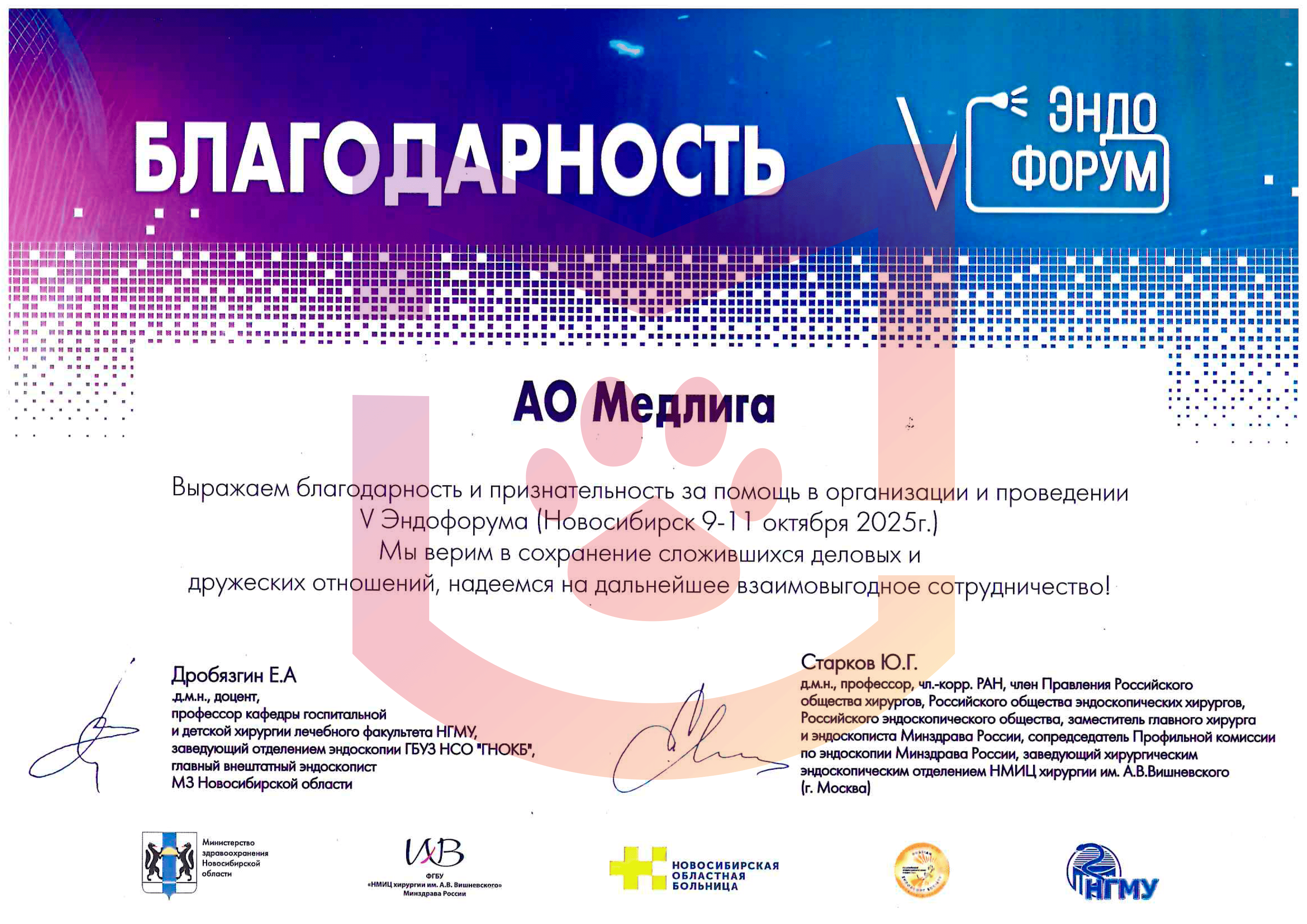 Благодарность за помощь в организации и проведении мероприятия «Эндофорум»