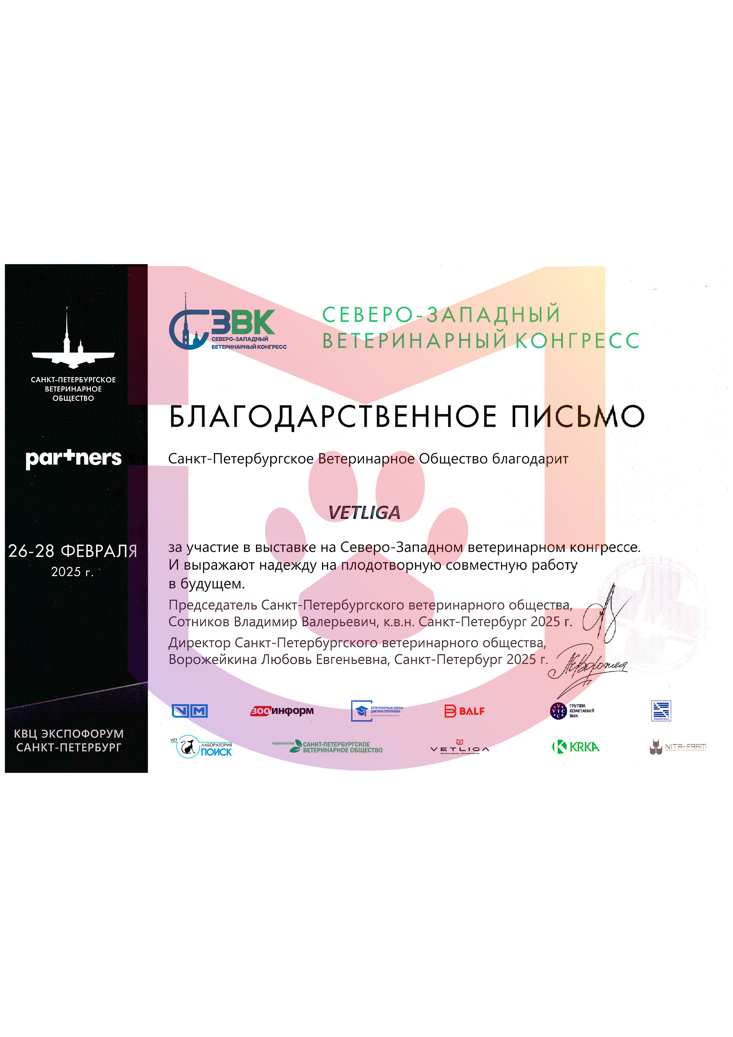 Благодарственное письмо от Санкт-Петербургского ветеринарного сообщества