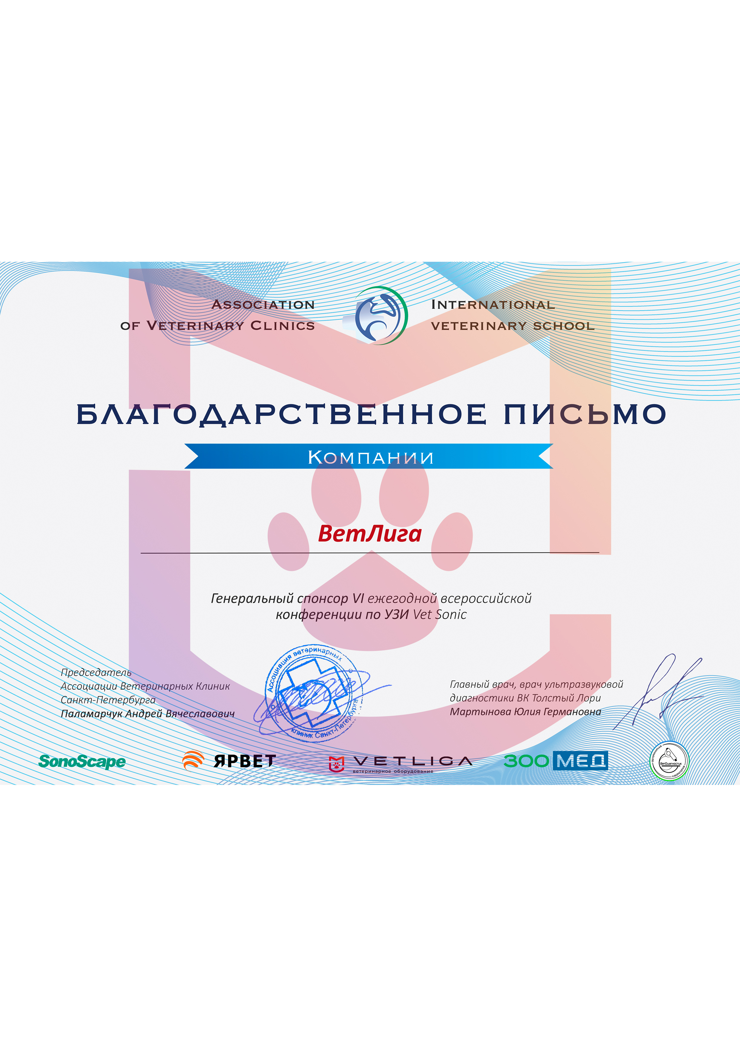 Благодарственное письмо от всероссийской конференции Vet Sonic