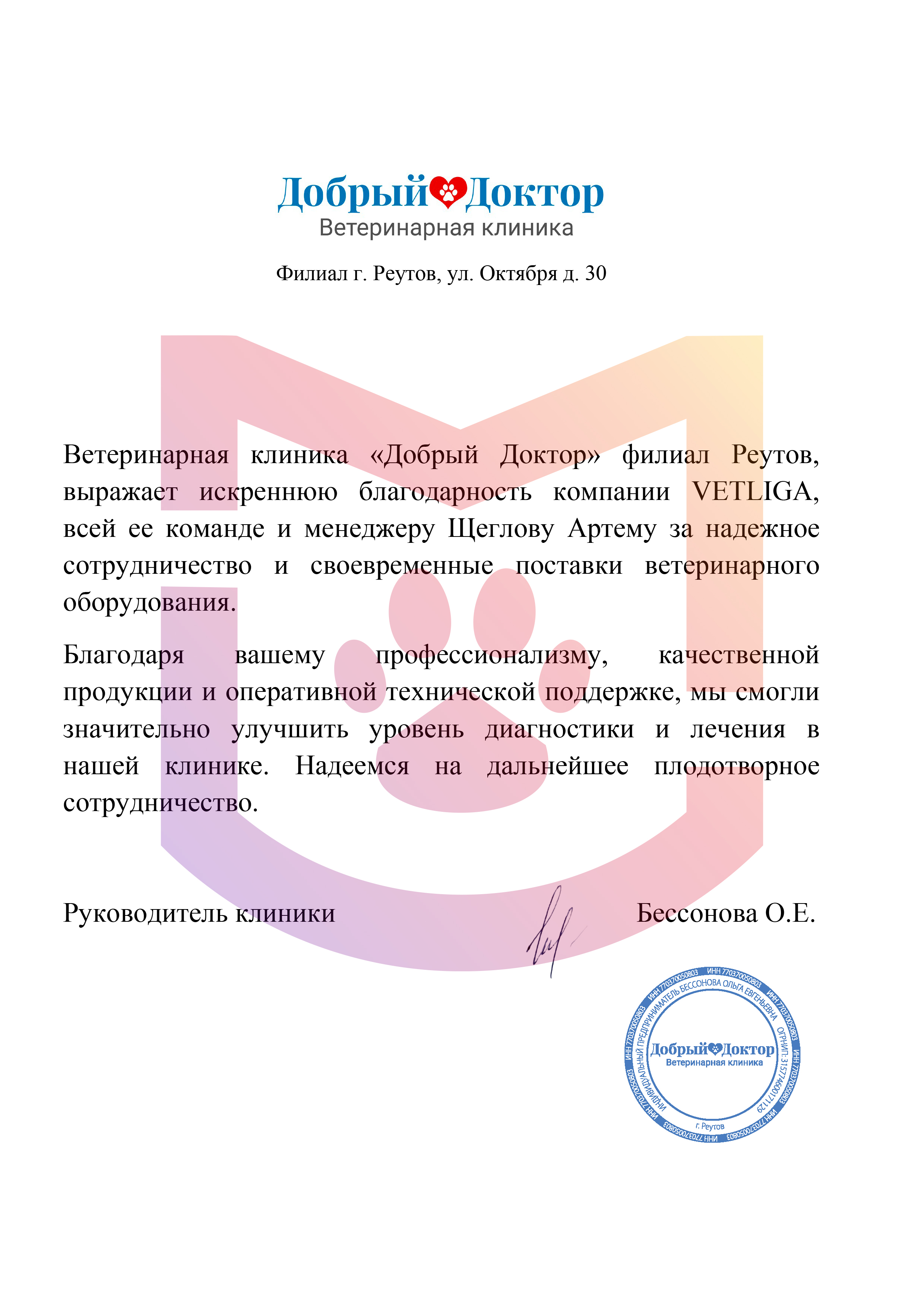 Отзыв от ветеринарной клиники «Добрый Доктор» г. Реутов